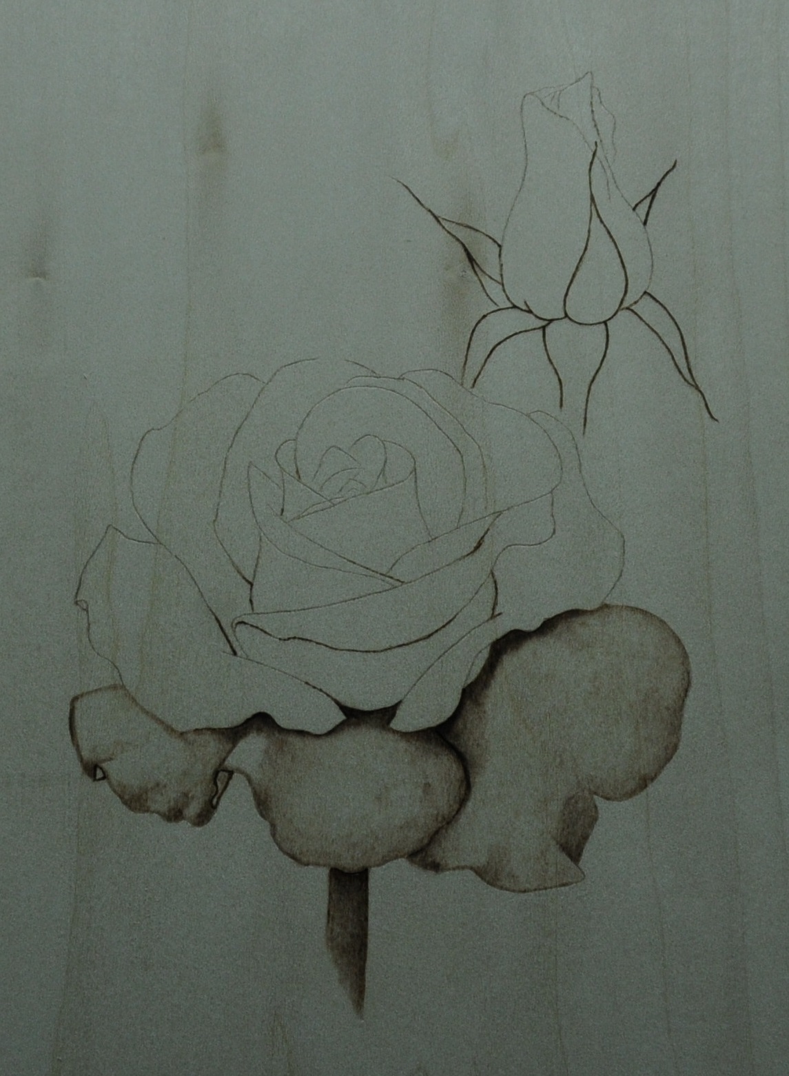Using the writing pen tip I burned dark lines along the edges of the petals where the shadows would be. I also burned the leaves and stem lines darkly. This step helped me visualize where the shadows would be and provide a sharp crisp line to define those spots.