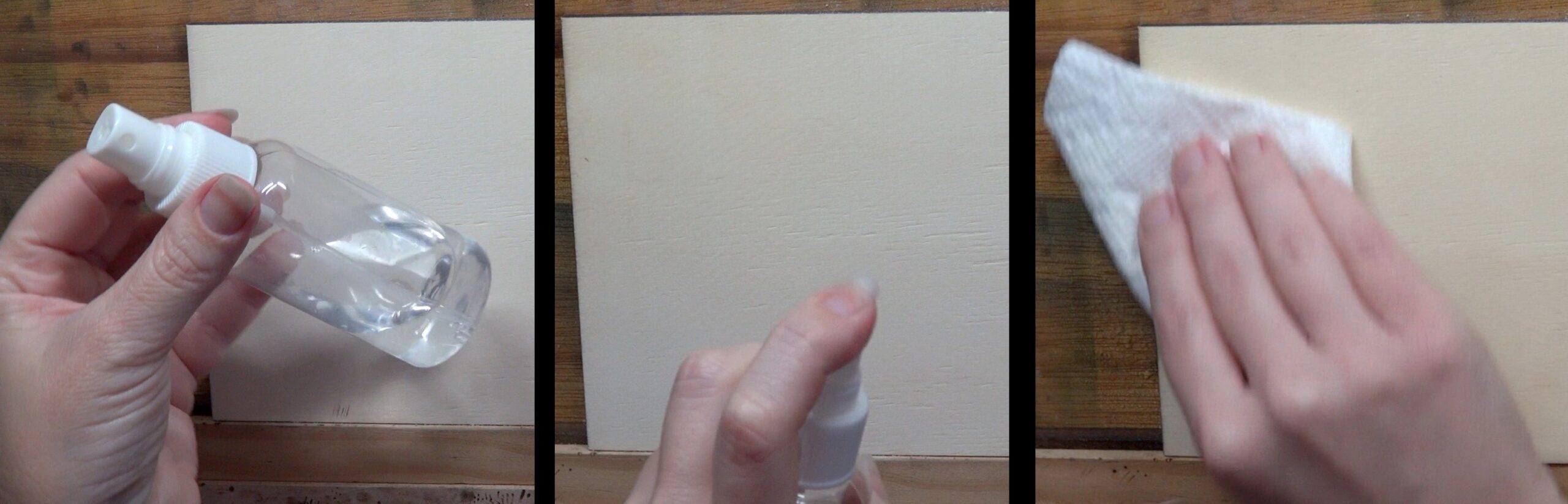 2) Thoroughly wet the board by misting it with water or wiping with a damp cloth. I keep a little spray bottle filled with water for this purpose. Make sure you spray the entire board. It’s okay if it starts pooling or running. Remove and excess water with a dry paper towel or cloth.