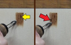 If you slow down your hand speed, the resulting burn will be darker in value. Speed up your hand and the burn will be lighter in value. So, if you want uniform smooth color, it is important to keep your hand moving at a steady speed.