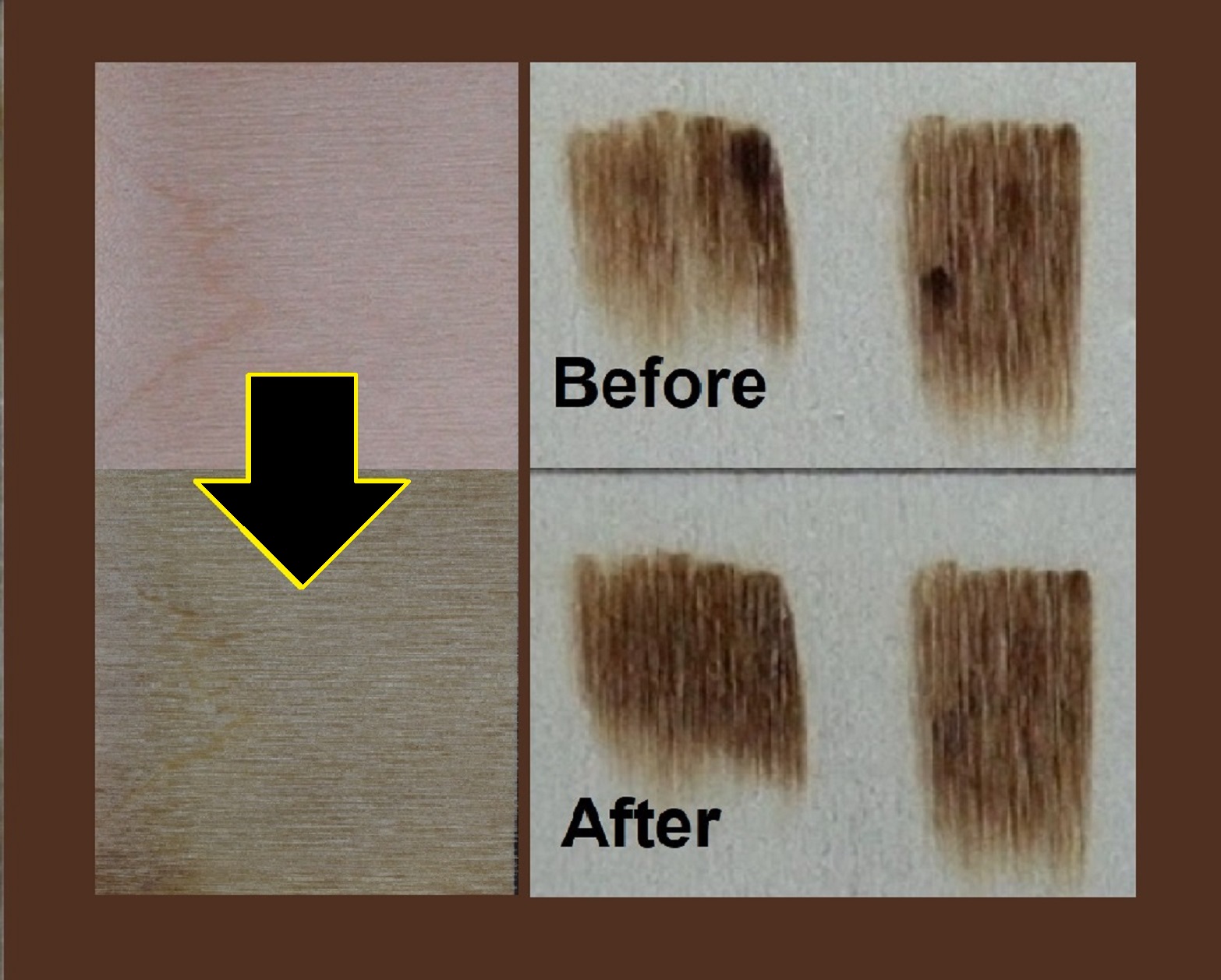 The far right section on the composite photo shows a close up of the board and after I scraped away the dark blotches. The scraping method is a bit time consuming and tedious to do, so I only use this method for small blemishes.
