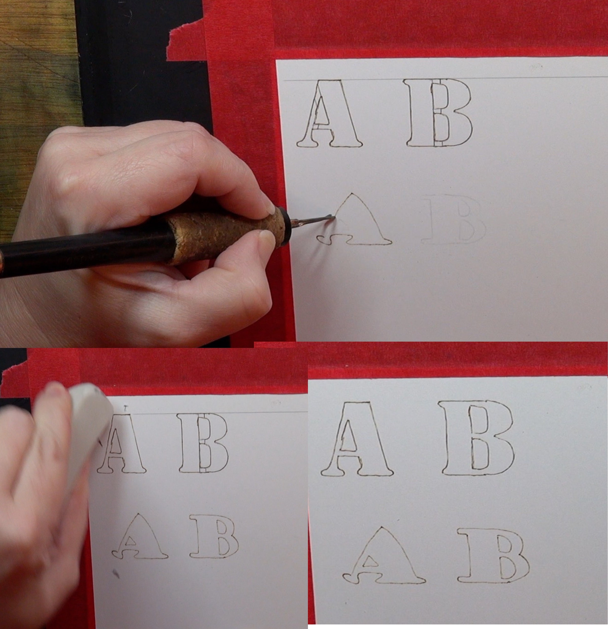 Once the lines are in place, then using a writer pen tip to burn along the outer edges of the side of the letter. After the pencil lines have been burned over, then use an eraser and rubbed over the area to remove residual graphite.