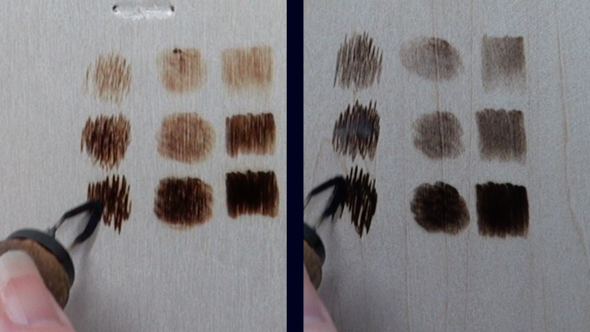 In this split screen image, there are three columns of burns on each board. The far left was made using uniform strokes. The middle column was made using circular motion. The left column shows the zigzag burn stroke.