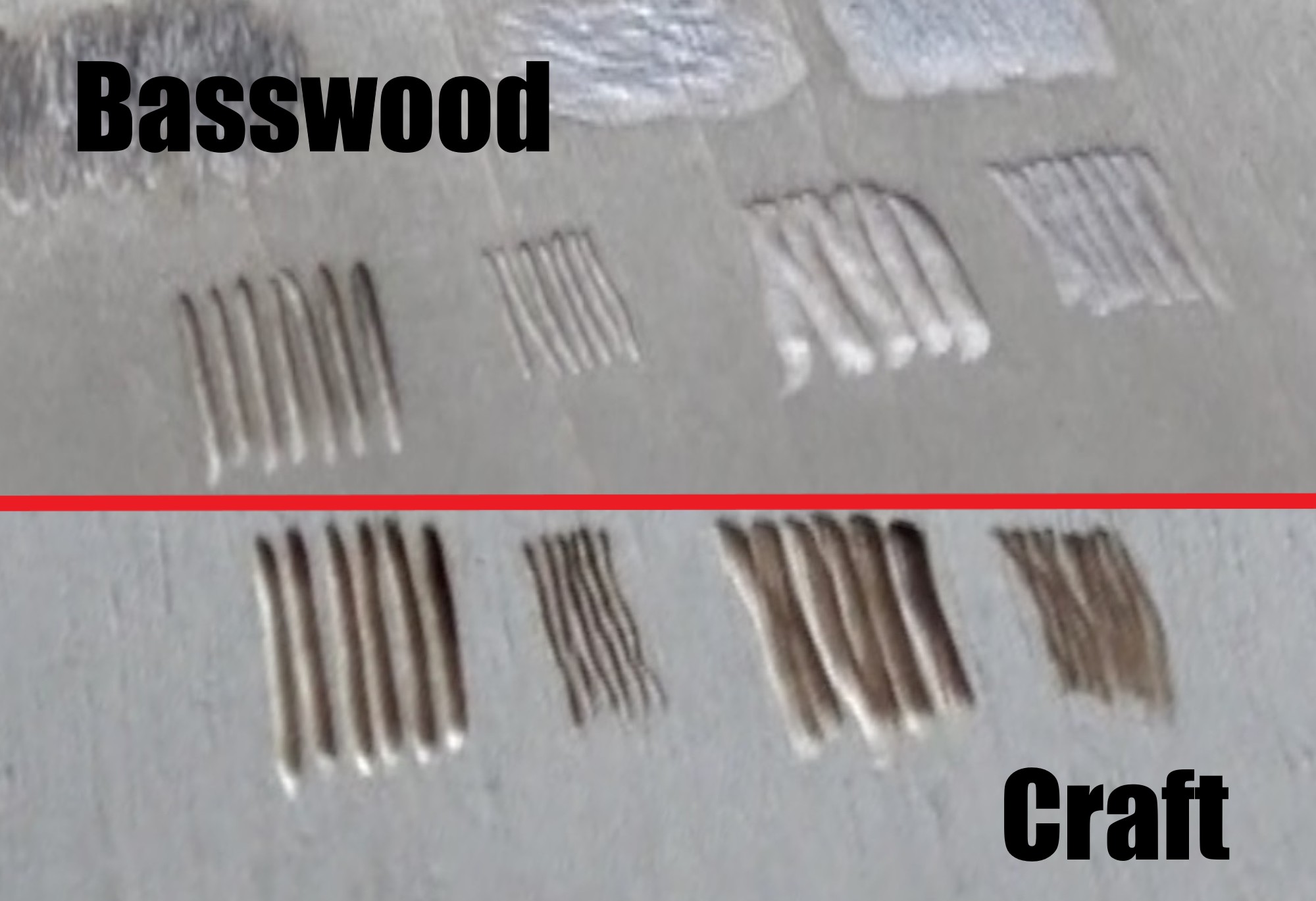 In this split screen comparison, the basswood board is above the red line and the craft board below. Notice how much deeper the lines are on the craft board.