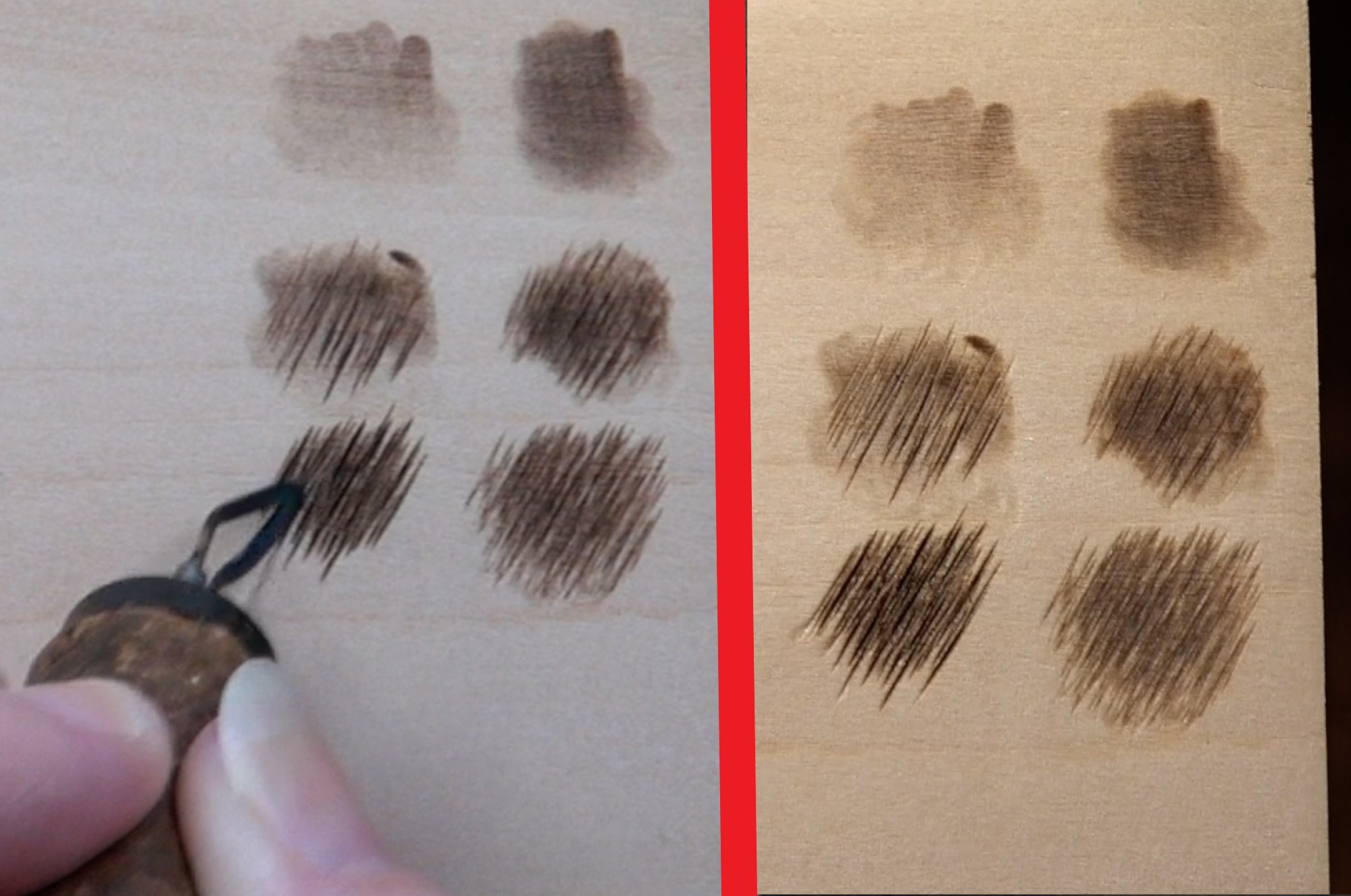 In this split screen shot, the craft board is on the left and the basswood board is on the right. I’m in the process of burning uniform strokes on both boards. With each burn patch I increase the heat setting on my burner.
