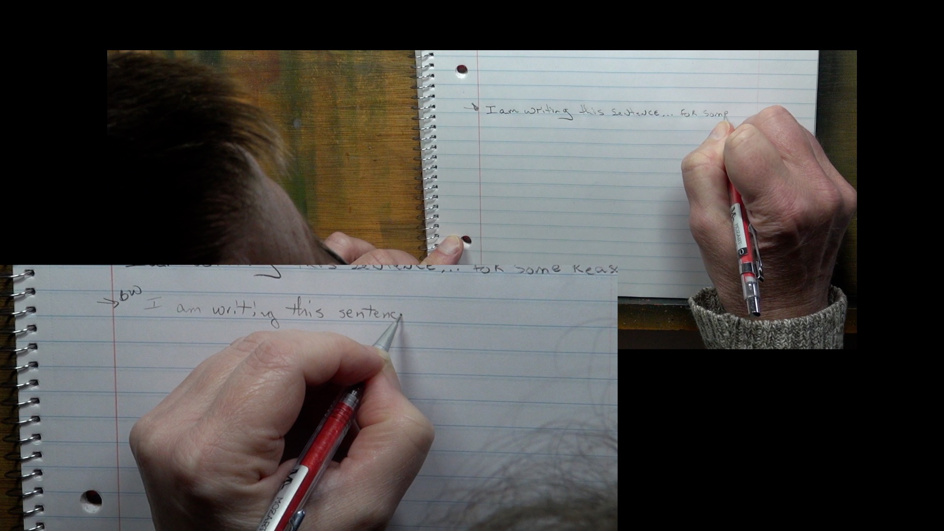 In this split photo, Todd is writing a sentence on a piece of notebook paper in the top portion of the image. The lower image shows me writing the same sentence that Todd did.