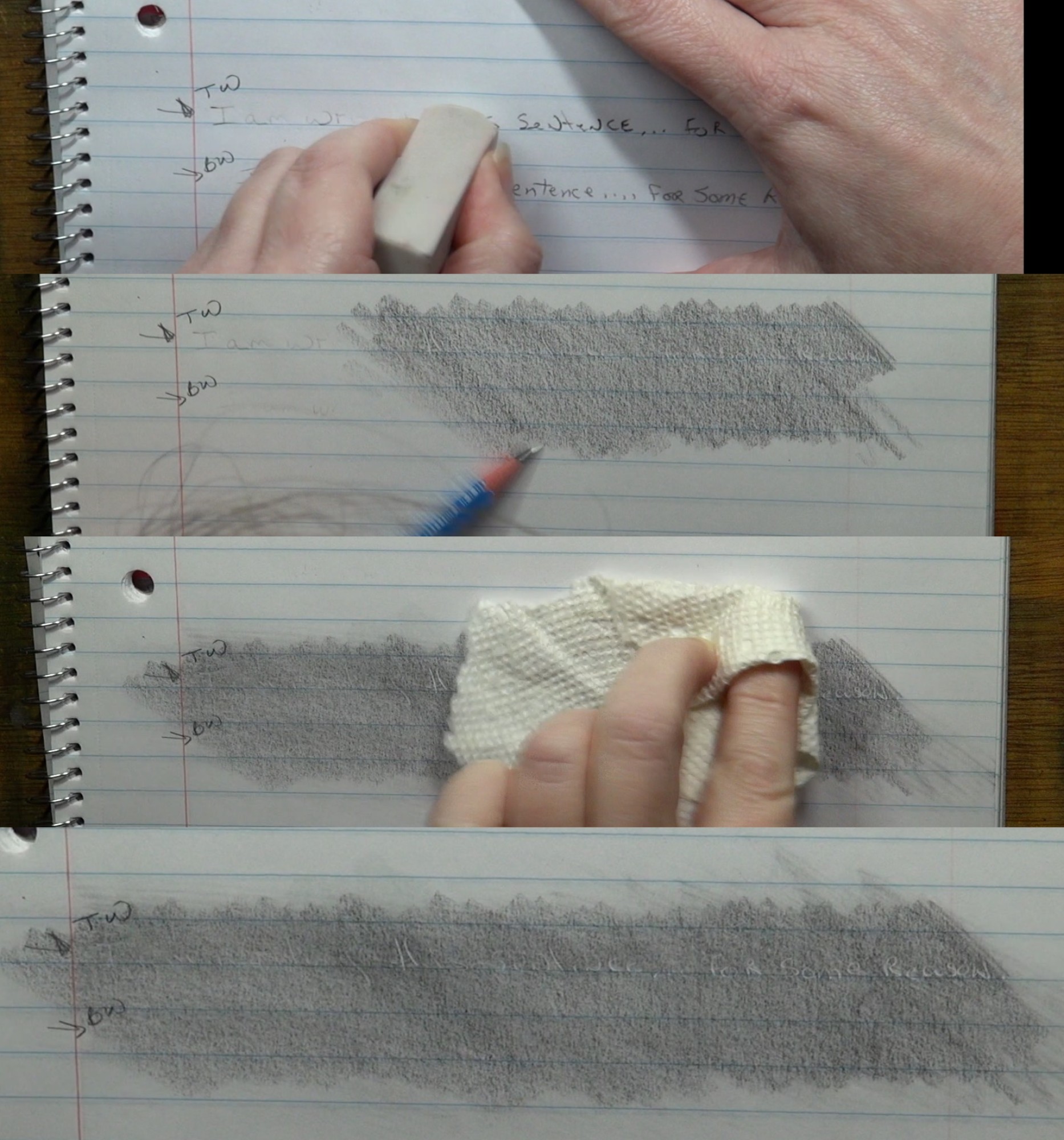 Now erase what you have written. Then gently color over the area using the side of a pencils. After that is done, gently rub over the pencil marks with a piece of paper towel to smooth out the graphite.