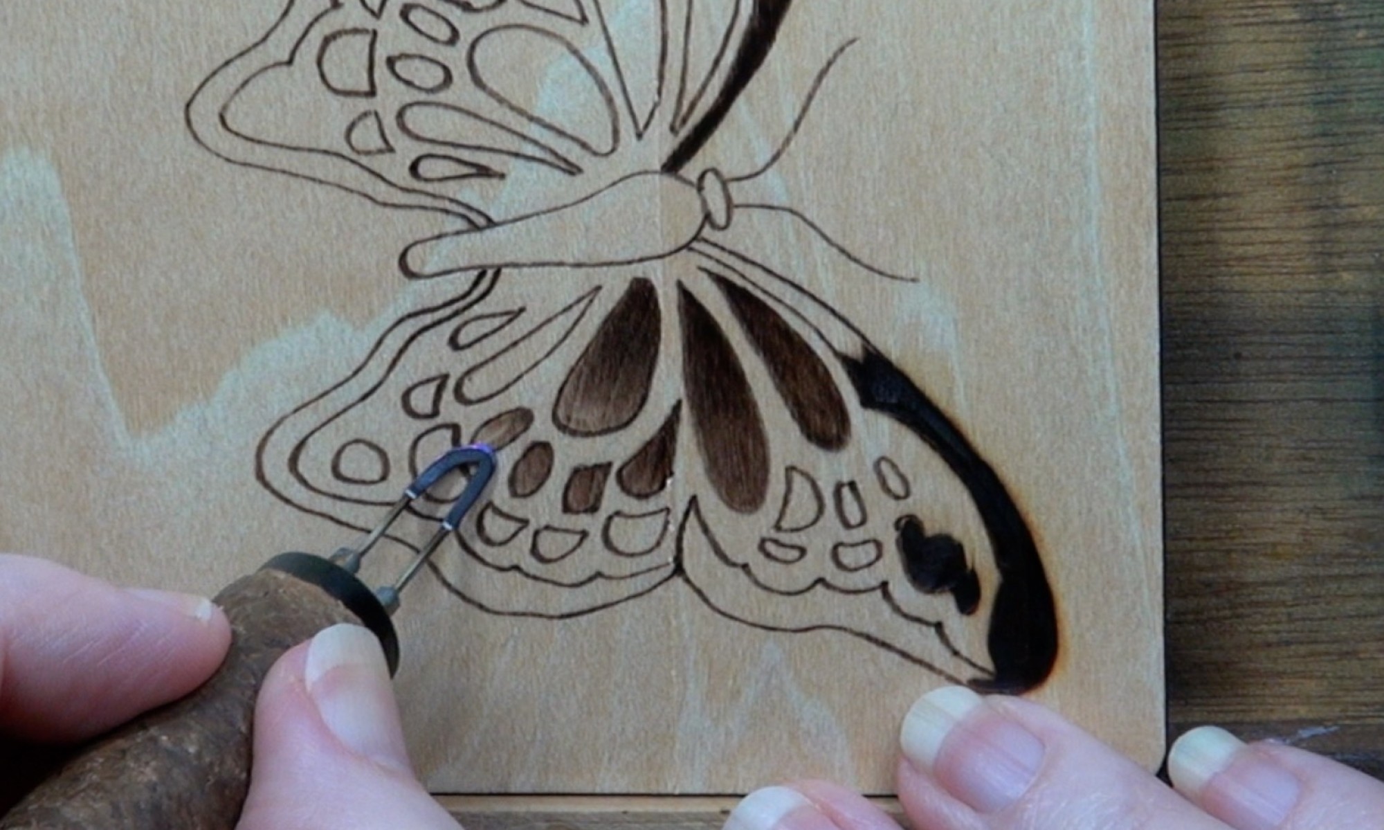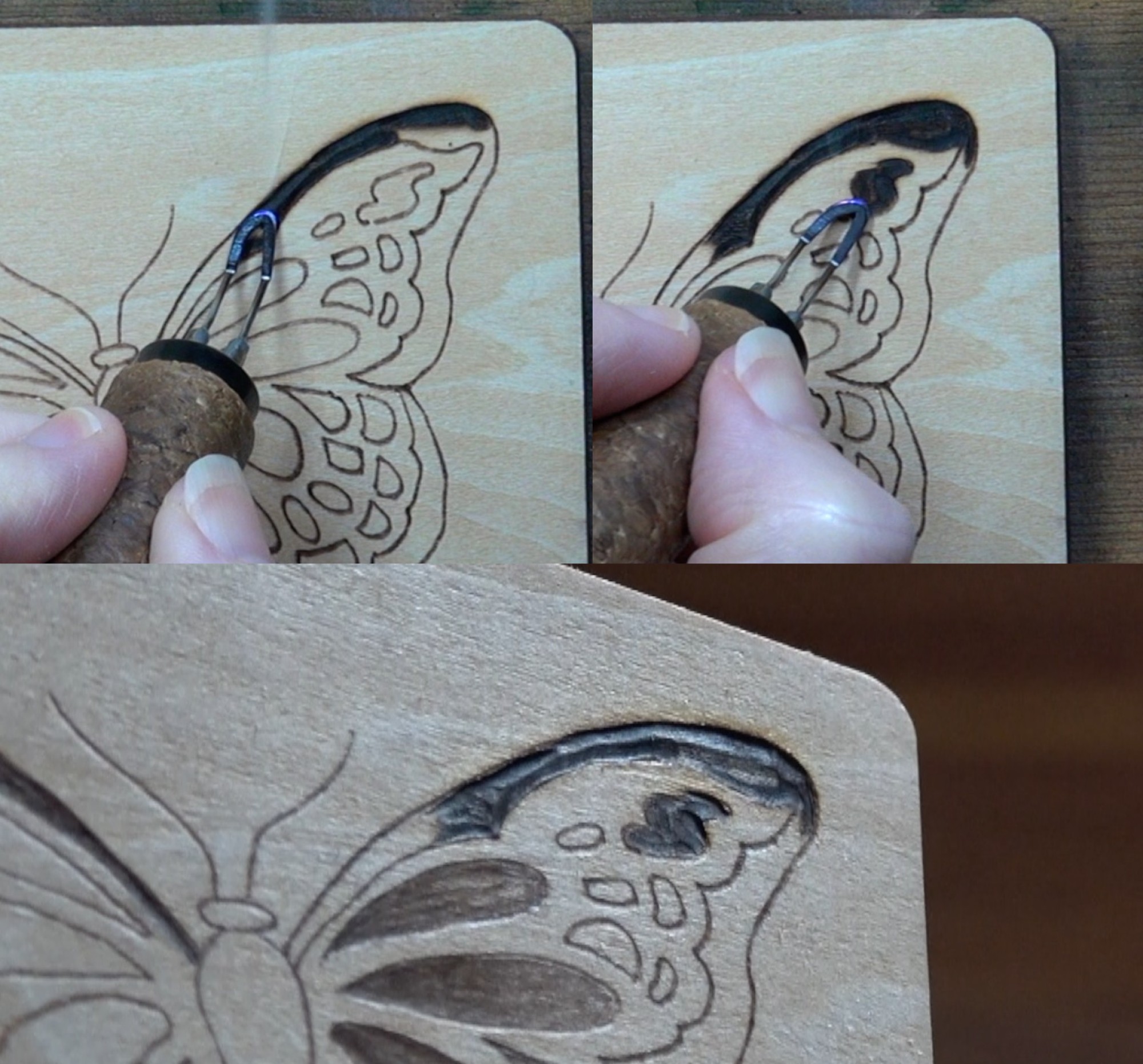 In this photo I’m burning a butterfly wing to a dark color. Notice how much smoke is being generated from the burns. Plus, there is some overburn just above the wing.