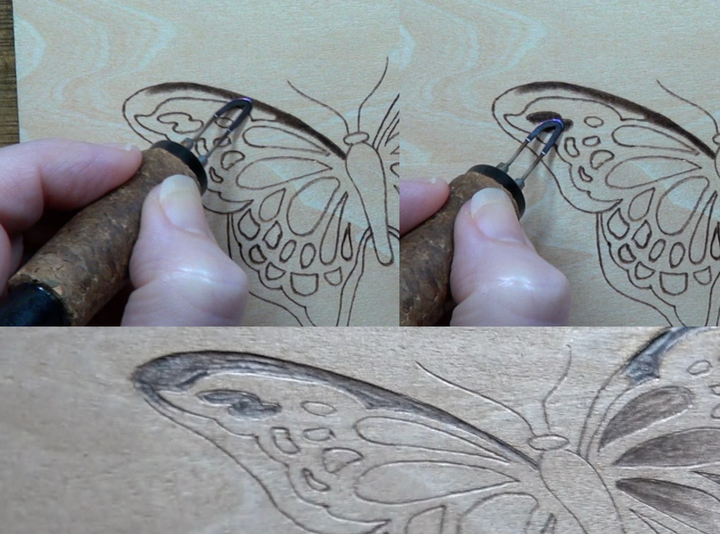 Below the black line shows an angled view of the board so that you can compare how much deeper the lines created using a heavy hand pressure are compared to the light hand pressure burns.