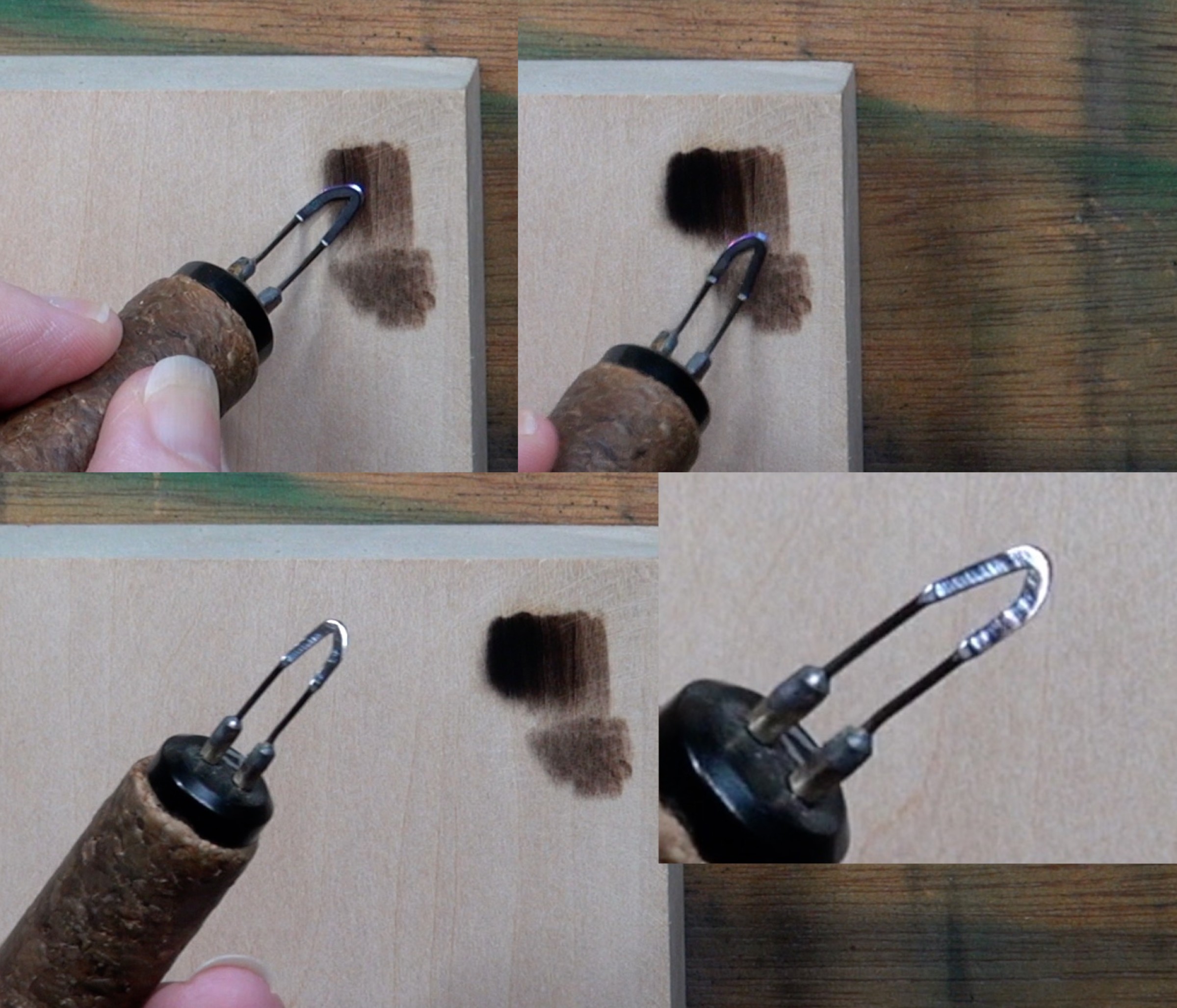 The top burn was created by first burning uniform strokes, and then I reburned over the area using circular motion. On the left we see that color quickly fades out because it was created using a heavy hand pressure. Even though I burned circular motion over the left burn, the color didn’t darken much if at all. Compare that to the right burn, and the impact of hand pressure becomes very noticeable. I should mention that I used the exact same nib and burn temperature for all of the burns.
