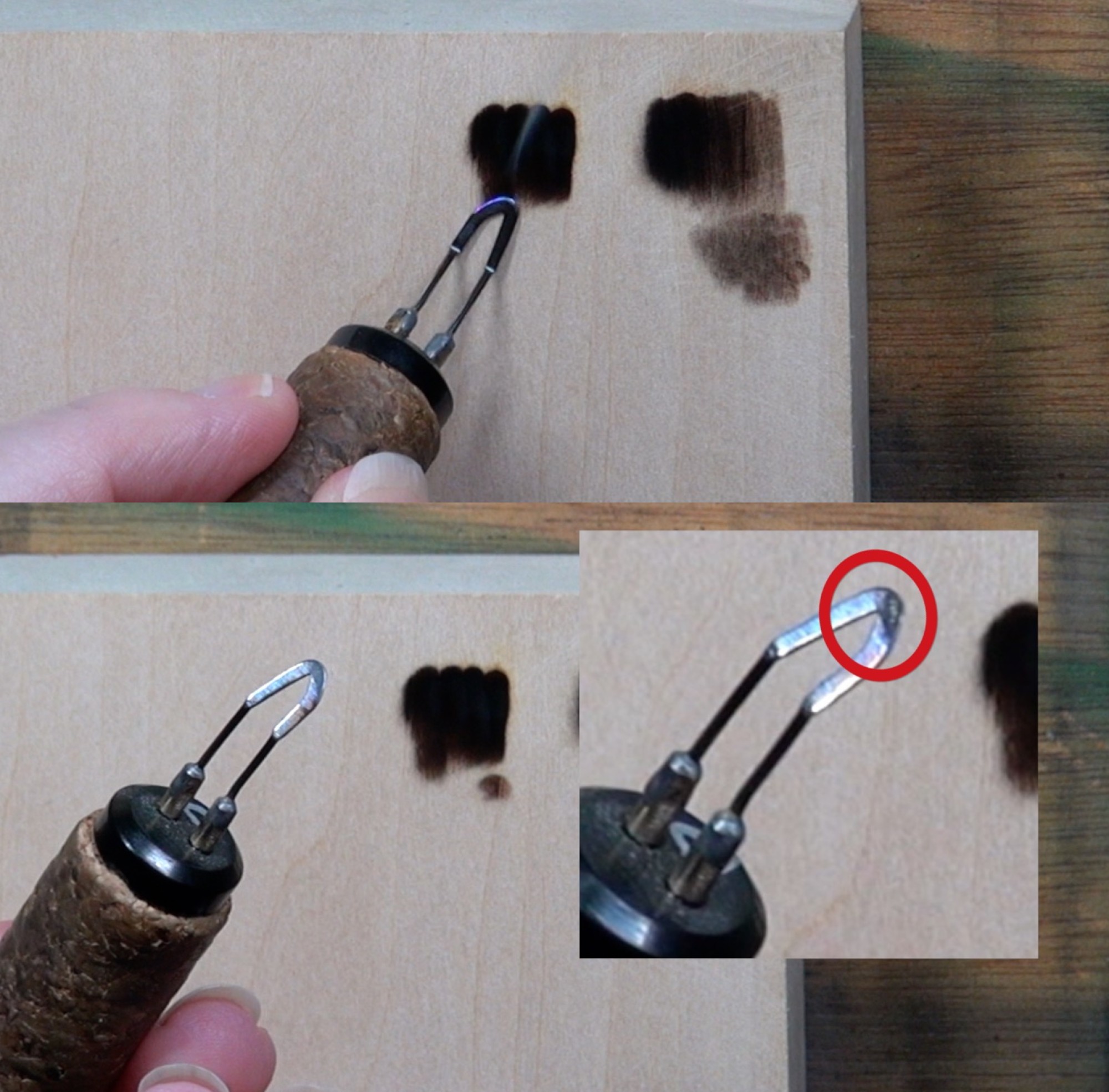 Now let’s talk about the two burn patches to the left of the blue box. These burn patches were made using the side or edge of the writer nib, so the lines are much thinner. The thinner and/or smaller a nib is, the higher tendency is has to sink down into the wood surface. The heavier your hand pressure the deeper the nib sinks.
