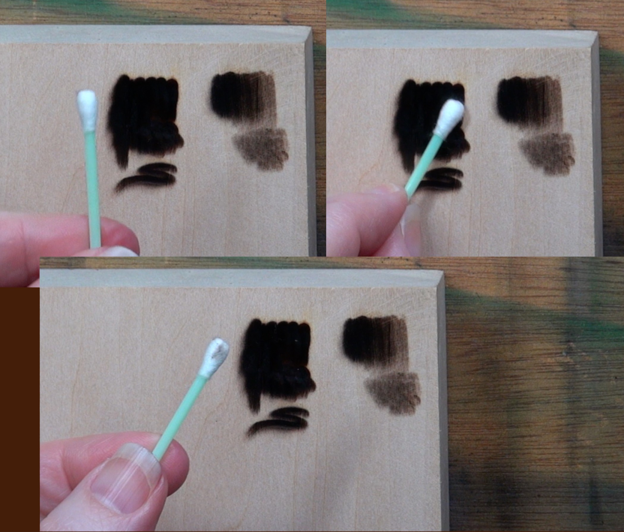 I’ve got a clean Q-tip and I’m wiping it over the first group of burns that were done at a lower heat setting. In the bottom photo you can see just the slightest bit of carbon residue was picked up by the Q-tip.