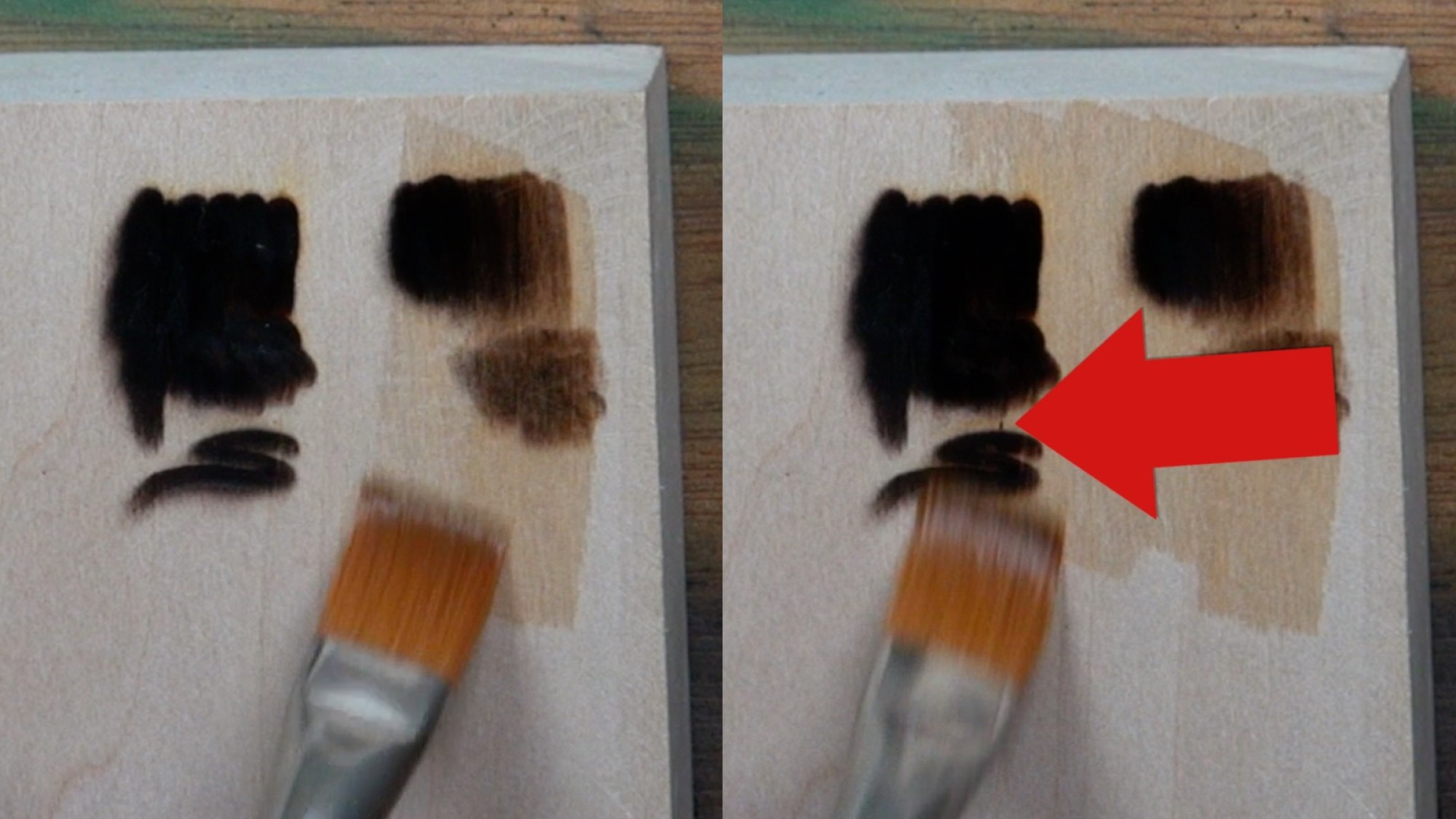 The red arrow is pointing to a bit of carbon residue debris that the brush loosened. These bits of debris can become stuck in the paint or wood finish. Depending on how much carbon residue there is, the smeared debris can be very noticeable.