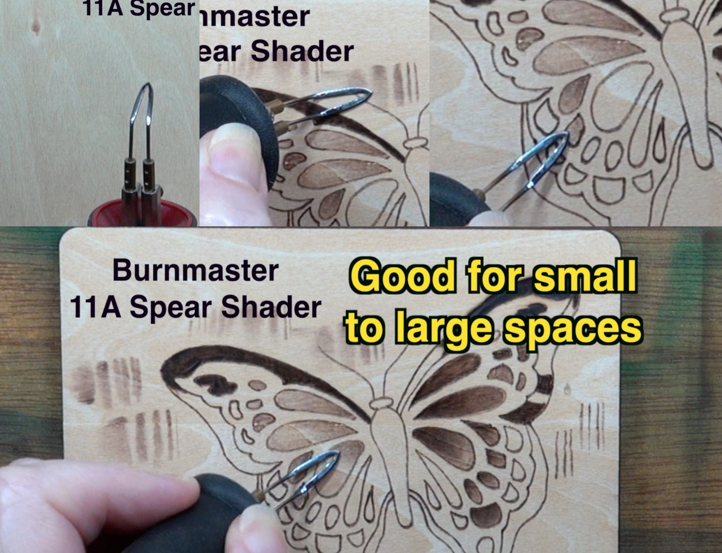 If you have an Optima burner, I recommend Optima’s spear shader. The point allows for really fine lines, and makes it easy to burn in small spaces. The side of the shader is good for medium to large spaces.